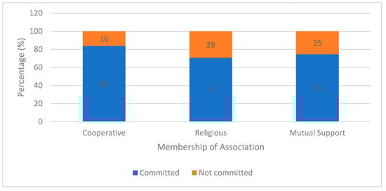 The distribution of Fadama III beneficiaries by their membership of association is shown in Figure 1. The level of commitment of the members to their association’s obligations was assessed using a scale of 1 to 10. Those who rated themselves above 5 were considered to be committed, whereas those who scored themselves below 5 were considered to be non-committed members. On the basis of this scale, the study found that 84% of the cooperative members were committed to their association’s obligations. In the same vein, 71% and 75% of the members of a religious group and a mutual support group were strongly committed to their association’s membership obligations. The level of commitment of the members to their socio-economic association can influence the level of benefits members can access from the association.