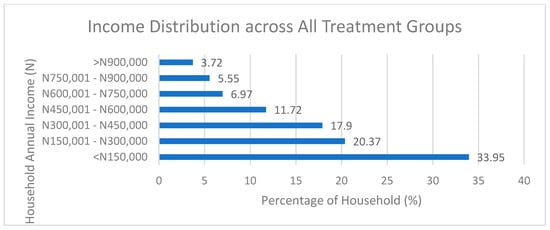 Figure 2 shows the distribution of the respondents by their annual income. The Figure reveals that about 34% of the households generate less than N150,000 (USD365) annually. The average farming household size of 6 in Nigeria [] implies a per capita income of N25,000 (USD60). If this is what about 34% of farmers in Ondo State earn, then this may not be considered a sufficient incentive to sustain them in the business. Similarly, about 20% of the households were making about N150,001 to N300,000 (USD365.1–USD730) annually. That is about USD60 to USD122 per capita for a household size of 6. The study also revealed that about 6% of the households were making N750,000–N900,000 (USD1824.82–USD2189.78) annually. This could give about USD304.14–USD364.96 per capita for an average household size of 6. Only 4% of the households were making above N900,000 (USD2189.78) annually, which implies more than USD364.96 per capita. The study revealed that about 84% of the households were making less than N600,001 (USD1459.85) annually, which implies USD243.31 per capita per annum. The average income is between the income bracket, N300,001–N450,000 (SD = 302,473.88). When the income distribution is compared to a poverty threshold of USD381.75/person per year (National Bureau of Statistics []), all the households in the study area who earn below N900,000 are below the poverty threshold. This further confirmed the huge proportion of farmers who are living below the poverty threshold.