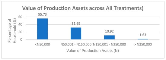 Figure 3 shows the distribution of respondents by the value of their production assets. The distribution of the household production assets was analysed across the treatment groups to determine the variations on the productive capacity of every household across the treatment groups. Figure 3 shows that 56% of the respondents reported the value of their production asset as less than N50,000, whereas 32% of the households reported the value of their production assets to be between N50,000 and N150,000. This distribution indicates that about 87% of the households have a very low production. Where there is no adequate working tool, production and productivity may be affected due to the inability to perform farm operations more conveniently or promptly.