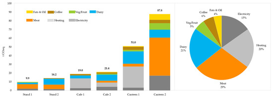 The share of emissions for every product on total emissions per gastronomy service are presented in Table 3. Having a closer look at specific food products, emissions depend on the assigned GS category, especially the share of dairy and meat products. In general, Stands 1 and 2 and Cafés 1 and 2 offer lower amounts and a lower variety of food products. Furthermore, it needs to be considered that Canteen 1 has the character of a café with lunch options. In comparison, Canteen 2 is one of the most common places to have lunch for university members.