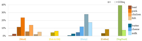 To better understand the relation of food products and their corresponding emission factors, Figure 2 provides an overview of the share of the total amount of products in [t] and emissions in [t CO2eq]. Here, one can see that, especially for vegetables and fruits, the amounts differ significantly. Although having a high share of vegetables in [t], the corresponding emissions are relatively low because of the lower emission factor. The opposite holds true for meat products, particularly for beef.