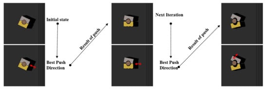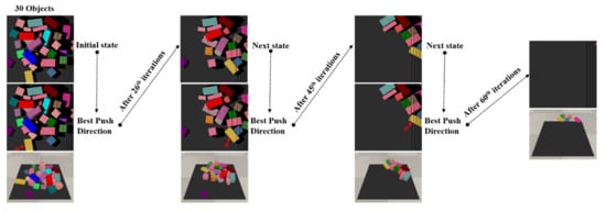 Some difficulties arise as a result of combining the two actions. From the literature, the push motion has been used to accomplish specific goals such as retrieving an object from its cluttered surroundings [28,30,34,54,55,56,57,60,61,62]. This approach assumes prior knowledge and relies on a predefined target object either using color, quick response (QR) code, or barcode objects. In object removal tasks [26,27,63,64,65,66], the pushing and grasping actions have been synergized by using two parallel FCNs, one each for grasping and pushing. The works of [9,27,67] are the closest to our work. Al-Shanoon et al. [9] proposed the Deep Reinforcement Grasp Policy (DRGP). DRGP [9] focuses on performing the grasp-only policy, with no other actions (such as push, shift, and poke) involved. This strategy encounters difficulty especially in a well-organized shape situation where there is no space for the robot’s gripper’s fingers to execute the grasp. The other two papers [27,67] focused on synergizing push and grasp using the maximum Q-value strategy, predicted by two FCNs. This strategy is considered the basis of our work. However, this strategy fails in certain cases because the robot proceeds to push the entire pile of objects, causing the items to be pushed out of the robot’s workspace. In addition, it performs a push movement when it is not necessary, resulting in a series of grasping and pushing actions due to the estimation of grasp points and push direction on separated FCNs.
