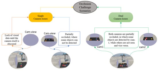 The second challenge is the scenario of occlusion avoidance. Several studies have effectively performed grasping tasks. However, to achieve grasping in clutter, where objects are stacked on top of each other in a randomly cluttered scenario [28], a single-perspective view is insufficient. Additionally, employing multiple views of a single movable camera [24] to increase the probabilities of grasping success in clutter would not be an adequate solution. This strategy suffers from a lack of visual data until the camera itself is obscured, and there is no other camera available to compensate for the lack of a visual sensor. Although multiple views have been implemented to grasp occluded objects [59], there has been no consideration of whether one of the cameras is totally obstructed or both cameras are partially obscured. Additionally, how the two cameras compensate for each other throughout the grasping task to avoid such difficulties remains to be explored. To alleviate clutter and occlusion, however, executing the grasp action using dual camera-based multiple views as complementary parts has not been previously considered. Figure 3 demonstrates the occlusion problem, where one of the cameras is fully or partially occluded.