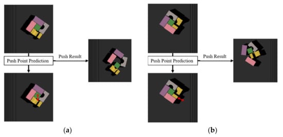 Push action’s efficiency in detaching objects from their arrangement: (a) shifting a specific object (proposed MV-COBA); (b) pushing the entire pile (VPG policy [27]).