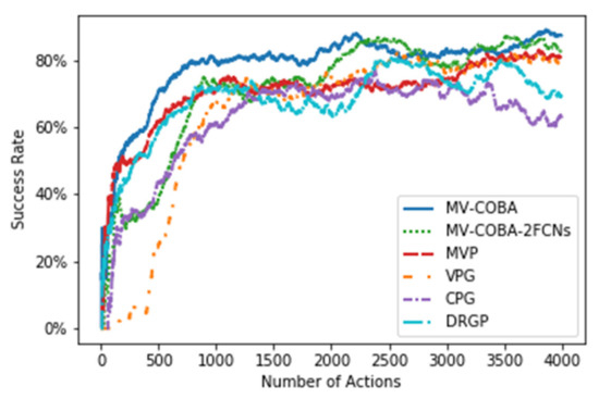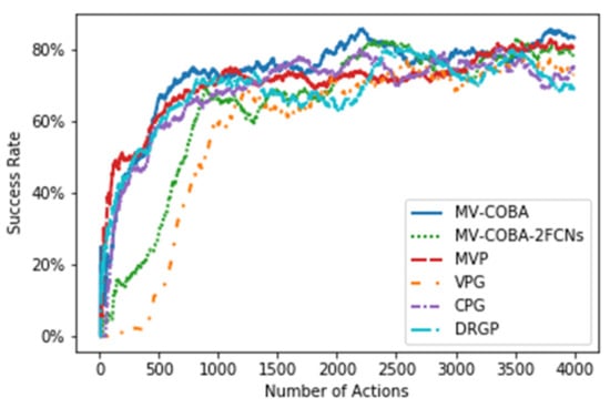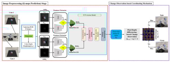 Comparing other recent grasping methods, e.g., [26,27,67], the authors of these studies attempted to solve the issue of retaining object arrangement forms by combining two actions. Their methods, on the other hand, have certain limitations. Firstly, they performed the process of synergizing two actions based on the maximum value, in which they trained the grasping and pushing actions on two separated neural networks in a parallel manner and then selected the maximum value. This strategy, however, occasionally fails to detach the objects from the arrangement due to the push behavior. Secondly, their approaches were tested on detaching the objects from their arrangement shape, where they did not take into consideration the randomly arranged objects. Lastly, they mapped the visual observation to actions using just a single view. Those who used multi-view-based grasping tasks (e.g., [24,40]) used a single camera-based multi-view strategy, where there is no consideration of whether the camera itself is fully or partially obscured, causing the robot to fail to complete the task. Additionally, they performed the grasp-only policy, which cannot execute grasping since the objects are well organized, causing the robot to struggle to complete the tasks. In contrast, the proposed MV-COBA coordinated the grasp and push actions based on change observation rather than the maximum value. Differently, we trained both grasping and pushing actions using a single sharable neural network to avoid unnecessary pushes and ensure that shift actions were performed on a single object rather than pushing actions on the entire pile of objects. In our proposed MV-COBA, we also considered multiple views based on two cameras placed on opposite sides of each other. The goal of this was to improve the likelihood of a successful grasp and to avoid the occlusion issue in the event that one camera is completely obscured or both cameras are partially occluded, combining them to compensate for each other.