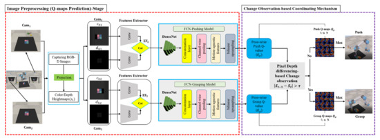 An illustration of the proposed MV-COBA is presented in Figure 5. The MV-COBA works in two stages. The first stage is to take multiple views of the workspace into consideration, which aims to increase the likelihood of grasping by having more complete visual data of the workspace. It helps to alleviate difficulty in generating dexterous grasping points due to visual occlusion in a single-view setting. In the second stage, the robot decides on a push or grasp action based on the highest Q-value (obtained from the first stage) and the observation of the visual change in the workspace.