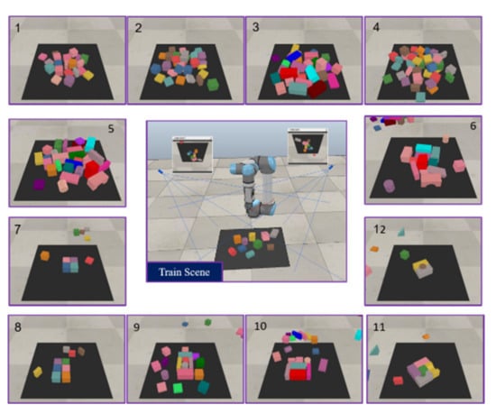 The challenge of randomly cluttered objects (test cases 1–6): The proposed approach was tested on four scenarios with a random selection of 20–40 objects cluttered together, as shown in Figure 7.