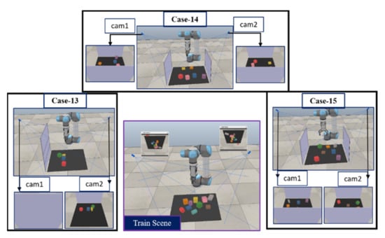 Catenation of multimodal features can provide important and complimentary information [69,70]. Thus, in this stage, feature fusion has also been used to fuse the extracted features from the multiples views using raw images to address the occlusion challenge illustrated in Figure 3. The goal of feature fusion is to compensate for the circumstance that one of the cameras is completely or partially obscured. This type of application could be beneficial in industrial line production when static cameras are employed to observe the robot’s workspace. For instance, if an obstacle obscures one camera’s view of the workspace, the second camera can compensate for the loss of visual data. Similarly, if both of them are partially obscured, they can compensate for the absence of visual input.
