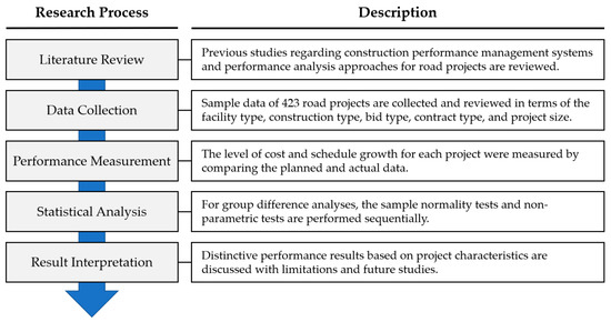 The aim of this study is to empirically analyze the cost and schedule growth of road construction projects, considering project characteristics. The research methodology is presented in this section, which introduces detailed information regarding the data characteristics, performance measures, and analysis methods. Firstly, this study uses national-level project performance data from the post-construction evaluation database. This database includes information on phase-based project performance, such as cost, schedule, and change order. In this study, a master database of 423 road projects completed from 2001 to 2018 is created and used. Secondly, this study measures the level of cost and schedule growth for each project by comparing the planned and actual data, focusing on the cost and schedule performance. Thirdly, comparative performance analyses are performed using different project characteristics (i.e., facility type, construction type, bid type, contract type, and project size). In this process, the sample normality tests and statistical techniques for group difference analyses are performed sequentially. Lastly, distinctive performance results based on project characteristics are discussed with limitations and future studies. Figure 1 shows the overall research process and description.