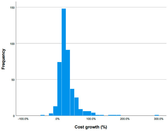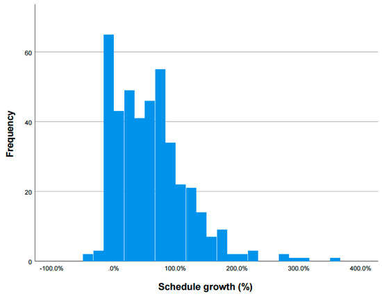Figure 2 shows the overall distribution of cost growth for the 423 road projects. This is a positively skewed (i.e., right-skewed) distribution, where the mean (28.5%) is greater than the median (22.6%). The cost growth ranges from −48.2% to a maximum of 295.7%, and has an interquartile range from 13.7% (first quartile, Q1) to 35.0% (third quartile, Q3). Figure 3 presents the distribution of the schedule growth. This distribution is more spread out when compared to that of the cost growth, ranging from −37.4% to 357.9% (mean = 60.7%, median = 53.5%). Particularly, the interquartile range of the schedule growth is from 14.9% (Q1) to 89.4% (Q3), which is much wider than that of the cost growth. This implies that the performance variability of Korea’s road construction projects is generally greater in terms of the schedule growth when compared to the cost growth.