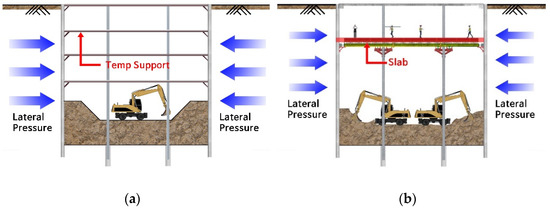 In summary, it was found that not only the vertical and horizontal displacement of the existing building columns but also the ground settlement can be significantly reduced by adopting the top-down method with slab pre-construction. In particular, buckling of the existing building columns and supporting members connected to the columns was effectively prevented. In this study, the top-down method with slab pre-construction was applied to the actual construction site for improving the stability of the target and surrounding facilities during construction, on the basis of the numerical analysis results.