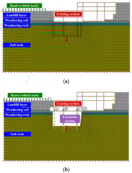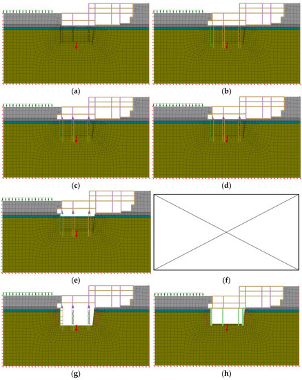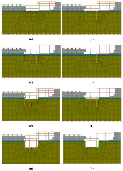 27]. A horizontal displacement constraint was selected for the left and right boundaries for allowing vertical displacement. On the other hand, horizontal and vertical displacement constraints were set for the bottom boundary, which is less significant because it is outside the excavation influencing range. Columns, slabs, and each supporting member (retaining walls, bracing, etc.) were analyzed under elastic conditions, and the self-weight loads of each material were applied. In addition, the vehicle load was applied to the road boundary as a dead load of 12.7 kN/m