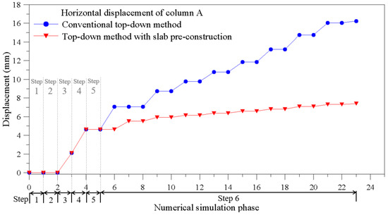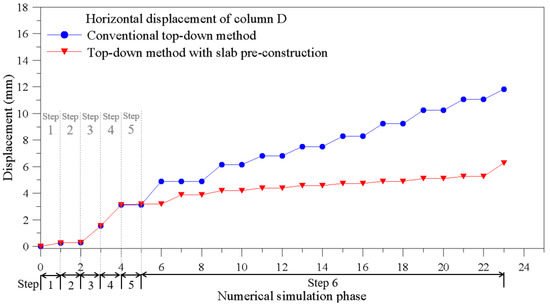 Figure 7 show the changes in horizontal displacement measured at column A (i.e., a road-side column of the existing building) and column D (i.e., a structure-side column of the existing building), respectively. The horizontal displacements from Step 3 (i.e., demolishing existing basement slab) to Step 6 (i.e., completing underground space excavation) were estimated for each construction step. Additionally, the changes in horizontal displacement for the two construction methods considered in the numerical model were compared (refer to