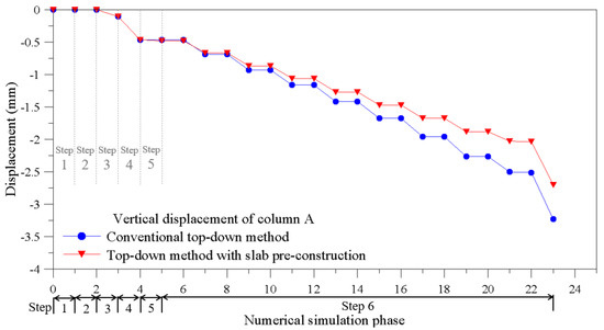 Similar to the horizontal displacement, as the surrounding load was more significant in column A, the vertical displacement was reduced more effectively at column A by pre-constructing the slab before full-scale excavation. Meanwhile, the reduction ratio of the vertical displacement due to the slab pre-construction was smaller than that of the horizontal displacement. The top-down method with slab pre-construction was more effective for controlling the horizontal displacement due to buckling of the existing building columns and supporting members than the vertical displacement.