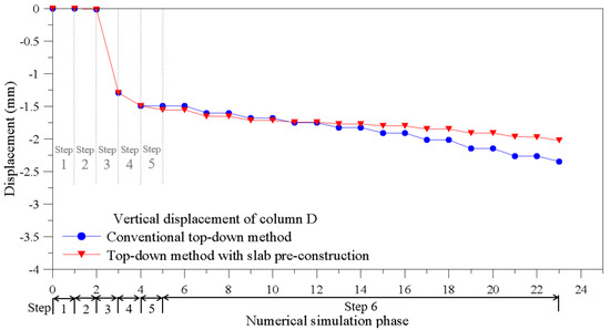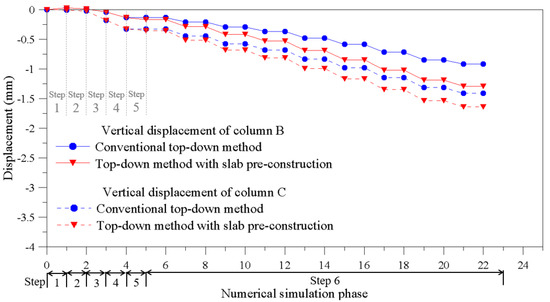 Figure 5 according to the construction methods (i.e., the conventional top-down method and the top-down method with slab pre-construction). The top-down method with slab pre-construction was simulated by seven construction steps. In contrast, the conventional top-down method excluded the step of pre-constructing the slab of the uppermost basement floor (Step 5 in