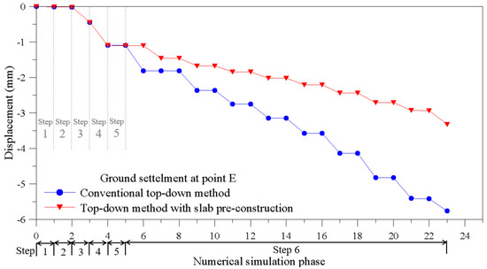 Figure 3b). Similar to the horizontal and vertical displacements of columns, the ground settlements at different construction steps were compared according to the construction method.