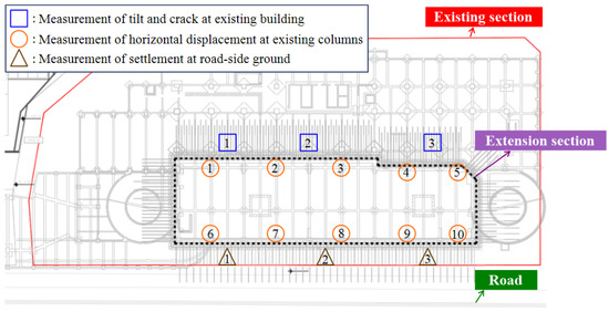 In order to investigate the stability of the existing building during underground extension work, the tilt and crack of the existing building, tilt of the existing columns, and settlement of road-side ground were measured from Step 3 (i.e., demolishing existing basement slab) to Step 6 (i.e., completing underground space excavation), as shown in