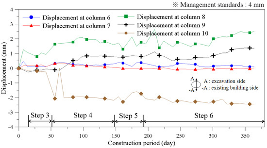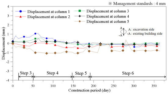 Figure 13). Since the position of columns 5 and 10 was a section with a haunch in the floor plan, the volume of underground excavation was relatively small. Thus, displacement on the existing-building side occurred more significantly compared to other columns. In addition, the displacements relatively fluctuated because the equipment was working near columns 5 and 10. However, the fluctuation of displacement was small, which could occur by an impact or mechanical error during construction. The displacements of the road-side columns were larger than those of the structure-side columns owing to the vehicle loads on the road. This matches the result of the numerical analysis, in which more significant horizontal displacement was estimated at the road-side column. Among the five columns located on the road side, the most significant displacement on the excavation side occurred in the middle column (i.e., column 8).