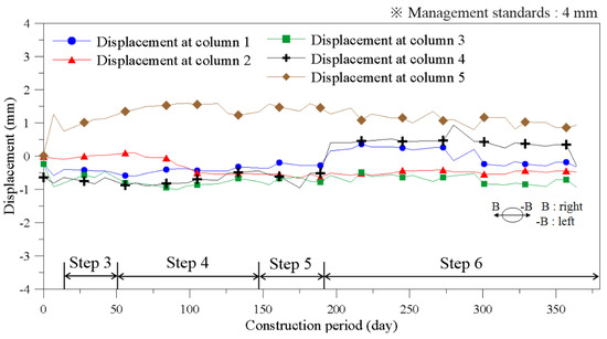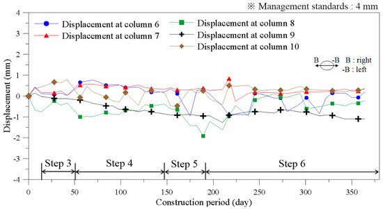 In the structure-side columns, left displacements occurred during Steps 3 and 4, except for the rightmost column in the floor plan (i.e., column 5). After the pre-construction of the slab in Step 5, the left and right displacements decreased in most of the columns, and the right displacement changed to left displacement in some columns (i.e., columns 1 and 4). Thus, it was confirmed that the pre-constructed slab effectively controlled the right and left displacements caused by the demolition of existing underground structures and initial excavation. In the road-side columns, right displacements occurred at the end columns of both sides (i.e., columns 6, 7, and 10), and left displacements occurred at middle columns (i.e., columns 8 and 9). The right and left displacements decreased after Step 5, as with the structure-side columns.