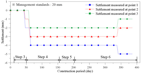 Figure 13. Then, the ground settlement was measured until the ground excavation was completed (i.e., Step 6) based on the initial settlement before the excavation work started (i.e., Step 2). The results are shown in