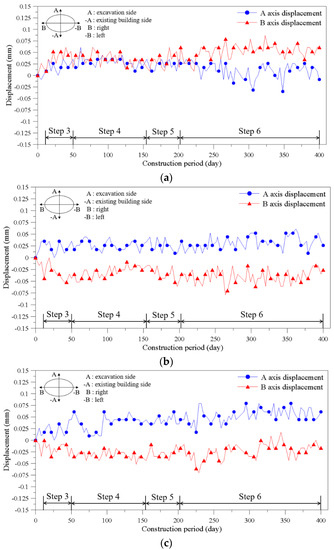 The displacements on the excavation side and left side were measured at points 2 and 3, similar to the tilt of existing columns. In addition, the displacements that occurred while existing underground structures were demolished and initial excavation was performed did not further increase with the pre-construction of the slab. However, the maximum displacements were estimated to be 0.079 mm to the excavation side and 0.07 mm to the left, which were insignificant. On the other hand, displacements on the excavation and right sides were measured at point 1. This was attributed to materials and equipment stored near point 1 from the beginning of construction. The weight of the equipment and materials stored in the pre-constructed slab acted as a load, which pushed the ground toward the existing building. The maximum displacements at point 1 were estimated to be 0.061 mm to the existing-building side and 0.087 mm to the right side. Compared with the management standard (i.e., 4 mm), the measured displacement was insignificant even though materials and equipment were stored during the construction period.
