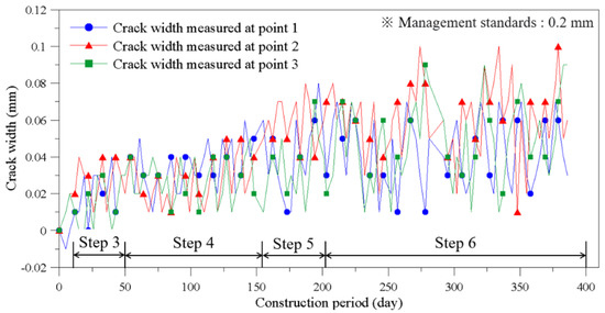 After the initial crack widths (32.59–38.19 mm) were estimated before the excavation work started, an increase in crack width was measured until the excavation was completed. The crack width increased to 0.10 mm during the construction. However, the crack width did not increase significantly and remained within the measurement standard of 0.2 mm after the pre-construction of the slab.