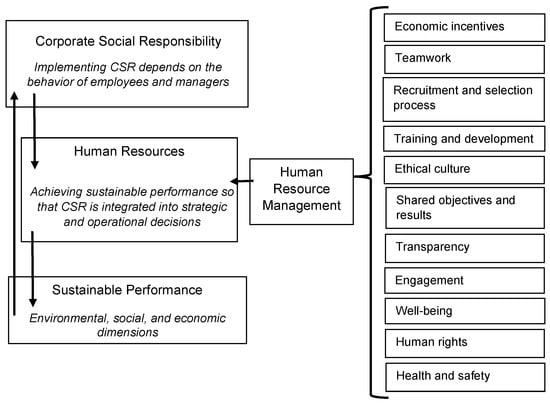 HRM is also a significant predictor of organizational performance, productivity, and individual work attitudes and behaviors [40] in achieving sustainable competitive advantage [41]. Aligning CSR strategies in the organizational operations requires support from HRM practices [24,42,43] to achieve SP (Figure 1): economic incentives; teamwork; recruitment and selection process; training and development; ethical culture; shared objectives and results; transparency; engagement; well-being; human rights; health and safety.