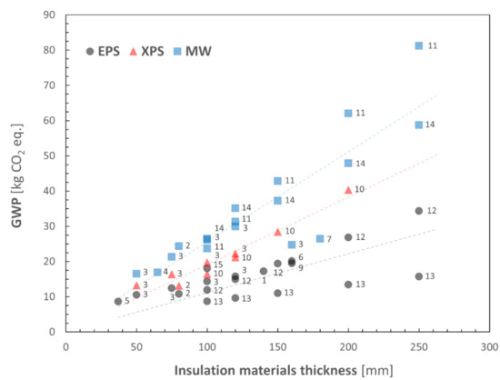 The study of the GWP indicators values indicates a general trend. Still, it unequivocally raises the question of the validity of using environmental impact indicators for the environmental assessment of ETICS by the manufacturer. Yet, plans for using environmental impact indicators for the assessment and verification of constancy of performance (AVCP) for construction products exist [69]. Additionally, when analyzing this issue, it is worth noting that the values of the environmental impact indicators following EN 15804 are calculated based on historical production data. Verified EPDs are valid for five years, after which the manufacturer re-evaluates the product. For each manufacturer, there are many changes in production over five years, which reflect in the values of environmental indicators. Often these changes are significant, e.g., in the five years between 2012 and 2017, the GWP indicator value for ETICS with EPS with mineral renders decreased by 22% for 10 cm EPS, 24% for 15 cm EPS, and 25% for a 20 cm EPS [70].