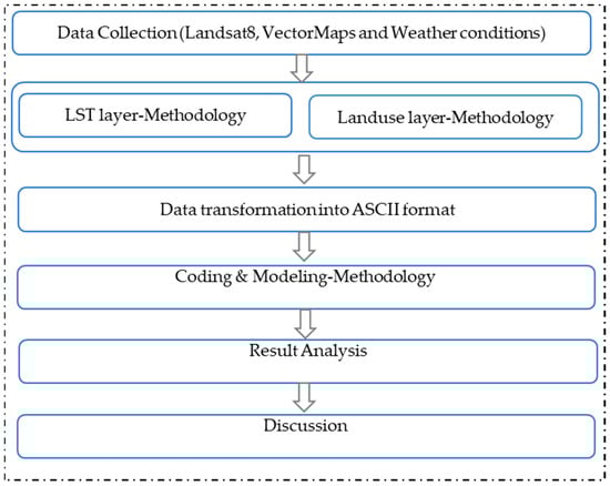 Changes in LULC are a root cause of UHIs [,]. Traditionally, land classification relies on band math calculations, such as the normalized difference vegetation index (NDVI), the normalized difference water index (NDWI), or the difference vegetation index (DVI), to identify the spectral characteristics and the conduct classifications of objects. However, because classifying an object whose characteristics are unknown is difficult, a supervised method of classification, the classification of the machine learning (multilayer perceptron (MLP)) algorithm, was used in this study.