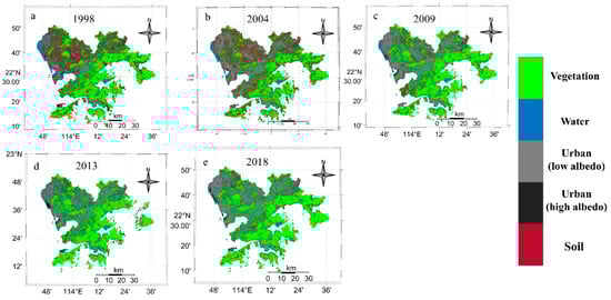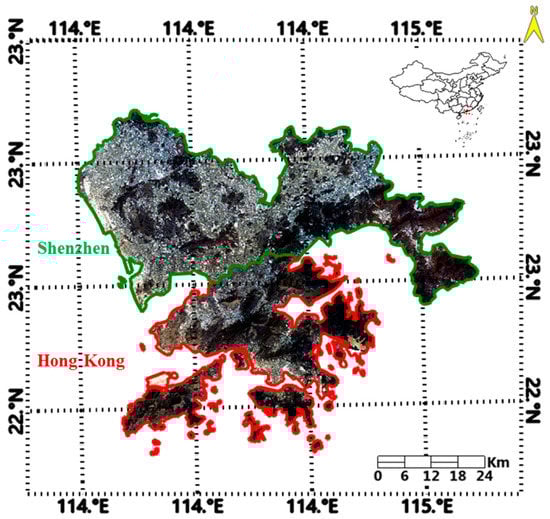 The authors are extremely grateful for the Landsat TM from the U.S. Geological Survey (USGS) and the regional map of Hong Kong data from the database of Global Administrative Areas, GADM. The vector map of Shenzhen was downloaded from DIVA-GIS. The atmospheric correction parameter and the temperature data from NASA (http://atmcorr.gsfc.nasa.gov/ accessed on 22 November 2021) and the Hong Kong Observatory are greatly appreciated in this research.