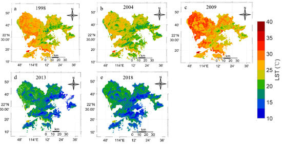 With heat waves becoming more prevalent worldwide, the UHI effect is increasingly attracting public attention. This study applied the RTE method to determine the LSTs [] in Shenzhen and Hong Kong using Landsat data from 1998–2018. The LST data indicated that relatively high-temperature areas occurred throughout Shenzhen but were smaller and more centralized in Hong Kong. In Shenzhen the relatively high-temperature areas were concentrated in the center and the west, whereas, in Hong Kong, it was concentrated in Kowloon and along the coasts of Lantau Island and Hong Kong Island, particularly at Hong Kong International Airport, consistent with previous research.