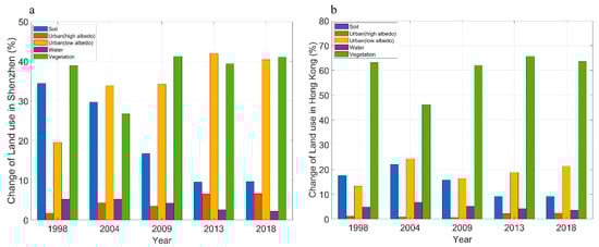Unlike in Shenzhen, forest dominates in Hong Kong. Although Shenzhen has attempted to increase its proportion of forest cover, it remains less than Hong Kong’s, which has a vegetation cover rate exceeding 60%. By contrast, the high-albedo area in Shenzhen is greater than in Hong Kong (Figure 4 and Figure 5). In addition, Shenzhen’s high-albedo coverage has increased, indicating that the use of high-albedo materials has increased, while Hong Kong has remained almost unchanged.