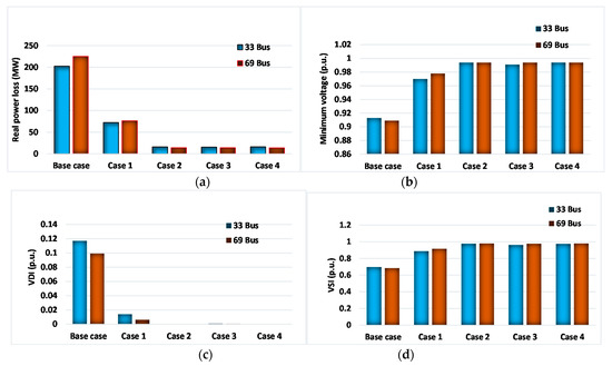 | Methods | Power Loss (KW) | DGs Size (MW)/Position | CBs Size (MVAR)/Position | Min. Voltage (p.u.)/Bus | VDI (p.u.) | VSI (p.u.) |