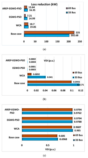 | Methods | Power Loss (KW) | DGs Size (MW)/Position | Min. Voltage (p.u.)/Bus | VDI (p.u.) | VSI (p.u.) |