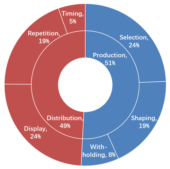 Figure 4 depicts the overall dispersion of the codes among the groups. From the interviews, we can see that gatekeeping behaviors exist in the domains of Production (51%, 94 codes) and Distribution (49%, 91 codes). The top categories, Selection and Display, with a share of 24% and 45 codes, respectively, were the most frequently addressed subjects across all stakeholder groups. This indicates that in the production and distribution sectors, content selection and display are the most significant methods for MCNs gatekeeping. Respondents’ statements on Shaping (19%, 35 codes) and Repetition (19%, 36 codes) are subordinate, whereas Timing (5%, 10 codes) and Withholding (8%, 14 codes) are the least discussed gatekeeping behaviors.