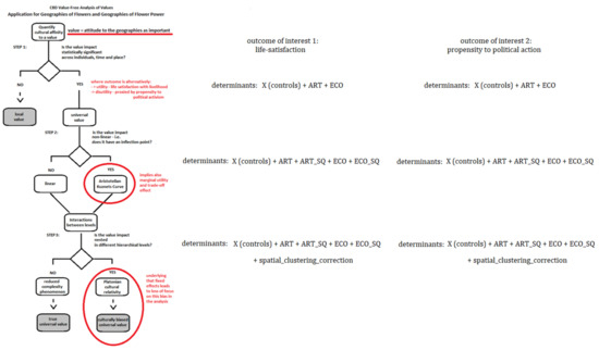 The Value Free Analysis of Values is an analytical approach proposed by Tubadji [22]. This is a CBD analytical approach, motivated by the paradigmatic understanding that any outcome can be an object for maximisation in human behaviour, and then the impact of attitudes towards the importance of this maximisation has to be studied in a value-free, i.e., objective manner. This can be achieved by following three analytical steps: (i) examining whether the cultural affinity impacts the level of the outcome (cultural affinity is the level of emotional attachment (i.e., affinity) towards a particular attitude (i.e., what level of importance this attitude has in the value system of people); this level is culturally calibrated in different localities (as one and the same attitude has a different level of importance in different cultures across space); it also contains a unique personally varying component as part of its formation for every individual. See Tubadji [22] for more details); (ii) examining whether there are inflection points in the level of impact from increasing affinity to the cultural attitude regarding the outcome (an analysis called Aristotelian Kuznets curve, aimed at establishing whether there is ‘too much good’ of the perception of a certain attitude as being good for the outcome (the idea of too much of a good thing belongs to Aristotle’s golden mean theory and has a line of literature in economic research. See Tubadji [22] for more details); for example—whether valuing the presence of green areas is always increasing one’s utility from an area or whether after some degree of affinity to green, a person’s utility from green starts to have a decreasing path; the marginal utility concept is indeed very much in agreement with the latter); (iii) exploring the spatial relativity of the cultural attitude effect (an approach called Platonian bias analysis). The above-described reasoning can be summarised in a decision tree diagram, as presented in Figure 1 below.