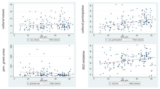 Geographies of flowers and geographies of flower power—cities level analysis. The fitted lines show the association of citizen’s satisfaction with the quality of the institutions with the locality to the geography of flower power (on first row, approximated alternatively by cultural venues or cultural participation) and the geography of flowers (on second row, approximated alternatively by percentage green areas or NO2 emissions).
