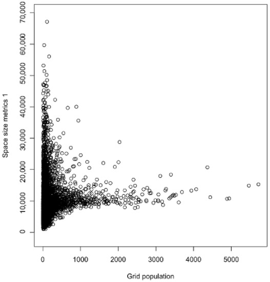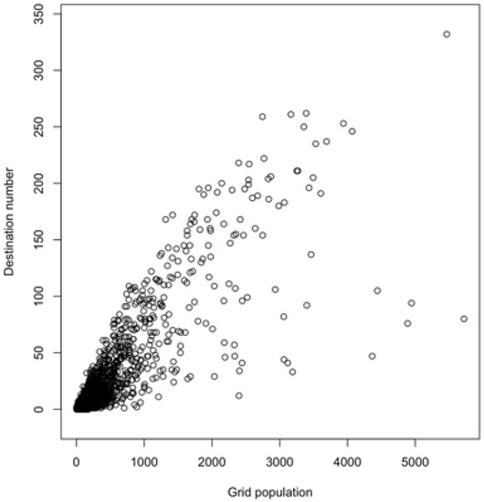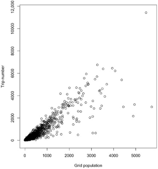 The total number of movements observed for the residents of each grid were strongly correlated with the population of the grid and the relationship appears to be linear (Figure 1). After normalizing the number of movements with grid population, their correlation was evidenced to be small (Table 2). Therefore, the second algorithm (NM/f(P)) is more appropriate for analyzing travel frequency using grid-aggregate data.