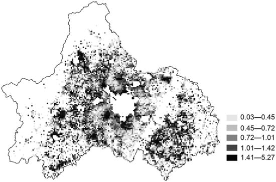 The analysis result for the travel frequency of suburban and rural residents in Chengdu is as follows. For the grids that are identified with any movements of residents, the average number of daily trips was 1.27 per person on weekdays. The spatial distribution of the travel frequency shows a highly mixed pattern, with multiple dark “hot spots” all around the region (Figure 2). Some of these active areas are located around the central city and some are at town centers, while there are also some “hot spots” far away from the central city.