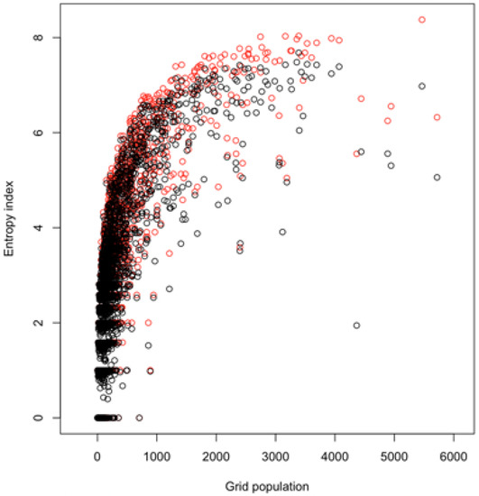 Relationship between grid population, entropy index and destination number. (black: entropy index, red: ).