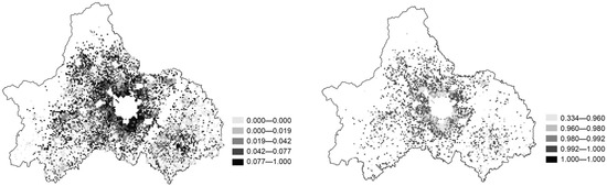 The analysis results of our study area are presented in Figure 5. Different from the pattern of travel frequency, diversity of travel destination was generally higher around the central city. This could be because there are many more locations in the central city providing jobs, products and services within an accessible distance so that the residents in the same grid are likely to visit more places. Residents in more suburban or rural areas do not have as many choices. The randomness indicator generally takes a high value (mean = 0.97), suggesting that there is no significant difference in the number of visits to different activity locations associated with each home grid.