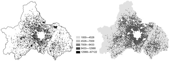We used mobile phone trace data collected between 12 and 18 April 2017 from China Unicom. One may doubt whether the usage of mobile phones is wide enough outside the central city to collect meaningful data, but due to the availability of low-price devices and the government’s infrastructure investments, the proportion of mobile phone users had reached 83% and the mobile phone signal coverage was 95% even in rural Chengdu when the data was collected [35]. Since the estimation of position based on mobile phone signals is not always accurate [36], especially in areas where signal towers are sparse, the positions were estimated into grids of one square kilometers (1 km × 1 km, 14,856 in total). We focused on the 14,209 grids outside the central city.