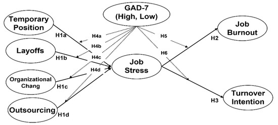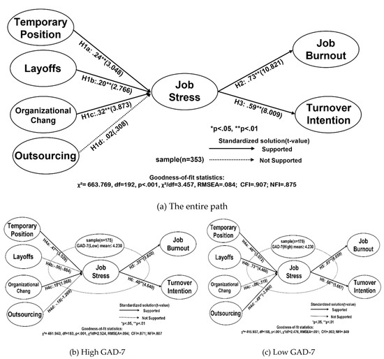 First, the model fit of the structural equation, which is shown in Table 4, was found to satisfy the criteria as a whole, and was judged to be suitable in explaining the structural influence relationship between the research concepts. Also, the results of path analysis are shown in Figure 3. The detailed analysis results are as follows. First, as a result of the test of Hypothesis 1, it was found that such changes in the employment environment as temporary positions, layoffs and organizational changes had a positive (+) effect on job stress, and that outsourcing had no effect. Job stress in Hypothesis 2 and Hypothesis 3 had a positive (+) effect on job burnout and turnover intention. With Hypothesis 4, regarding the difference in job stress according to changes in the employment environment measured using GAD-7, it was found that job stress had an effect on the temporary position and organizational change in the group with low anxiety. As for the group with high anxiety (n = 178), temporary positions, layoffs and outsourcing had an influence on job stress. As a result of testing Hypothesis 5 and Hypothesis 6, it was found that job stress inflenced job burnout and turnover intention. The group with high anxiety (n = 178, mean ≥ 4.230) had a greater effect on job burnout and turnover intention than the group with low anxiety (n = 175, mean < 4.230).