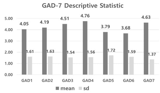 A nominal scale was used for general items of respondents, and a Likert 7-point scale was used with the items for hypothesis testing. As analysis tools, SPSS 21.0 and AMOS 21.0 package programs were used. As an analysis method, frequency analysis was performed for general items of respondents, followed by confirmatory factor analysis, and the hypotheses were verified with path structural equations modeling. In addition, to measure the level of anxiety, the Generalized Anxiety Disorder 7-item (GAD-7) developed by Spitzer et al. [54] and Lowe et al. [53], and adapted and validated by Seo and Park [40], was used. Following this, a descriptive statistical analysis of a total of 7 items was performed, and the group with high and low levels of anxiety disorder was divided based on the mean value of all items, with the difference in the influence relationship of each variable being analyzed.