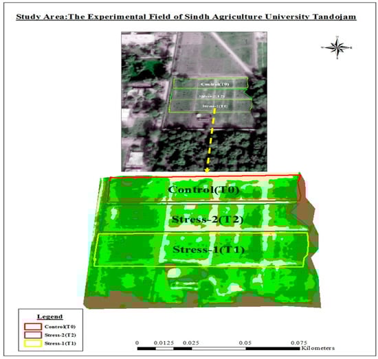 The geographical map representing the studied experimental field at Sindh Agriculture University Tandojam, Pakistan.