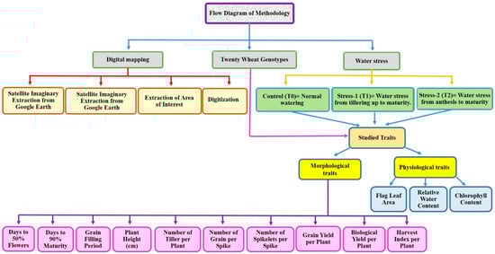 In the study, for screening of best water stress tolerant genotype, an ex-situ trial was performed during Rabi season at the trail field of Sindh Agriculture University Tandojam. The field was conducted in the field of the botanical experimental garden, near the central library at Sindh Agriculture University Tandojam, Pakistan. In this study, twenty wheat genotypes viz; Chakwal-83, Kohinoor, Abadgar-89, Anmole-91, TJ-83, Imdad-05, Kiran-95, Soghat-90, SKD-1, DRICK, Bhitai, TD-1, Sindh-81, Moomal-02, Marvi, Inqalab-95, Sarsabz, NIA-Sarang, Faisalabad-85, and Mehran-89 were evaluated under Split-Plot Design with three each replication and water treatment. Control (T0) was normal watering, T1 has water stress from tillering to maturity denoted as (Stress-1), and T2 has water stress from anthesis to maturity denoted as (Stress-2). The morpho-physiological traits are represented in Table 1. The study area of the experimental field is indicated in (Figure 1). The study flow diagram is represented in (Figure 2).