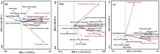Redundancy analysis (RDA) showing the association between the morpho-physiological traits of twenty wheat genotypes under different water treatments such as control (a), stress-1 (b), and stress-2 (c).