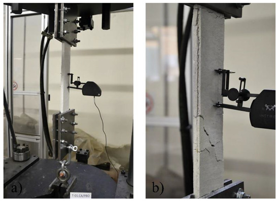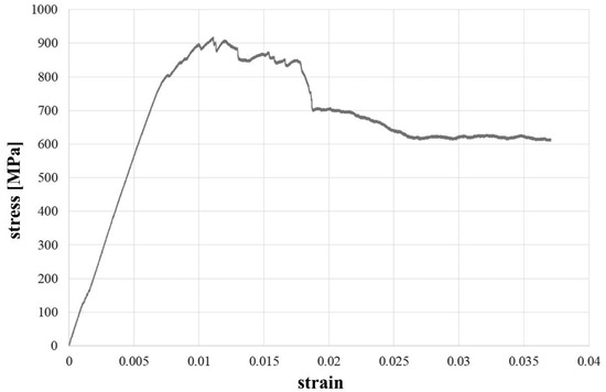 The stress–strain diagram (Figure 4) provided by the tensile test shows a rather linear elastic behavior until the peak load was attained and brittle failure occurred.