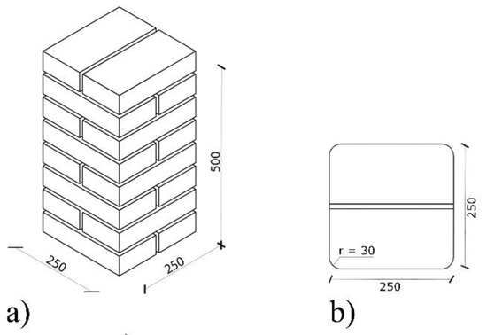 (a) Masonry columns to be tested. (b) Corner rounding of 30 mm.