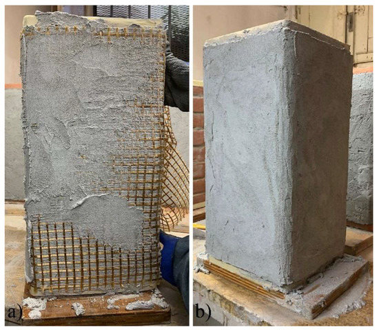 Then, column faces were cleaned and smoothed in order to eliminate surface defects and wetted in order to prevent the specimens from absorbing the mortar mixing water during the application of the composite material. Subsequently, a first layer of matrix was applied on the four peripheral sides of the columns with a thickness of about 5 mm (Figure 8a). Once the first layer was completed, the PBO mesh was quickly applied to the matrix around the column with an overlapping length of the net equal to 300 mm, as recommended in [23]. Finally, a second 5 mm thick layer of matrix was applied to cover the textile (Figure 8b). In order to avoid a direct load on the composite wrap during the test, a gap of 20 mm was considered between the top of the column and the beginning of the wrap itself.
